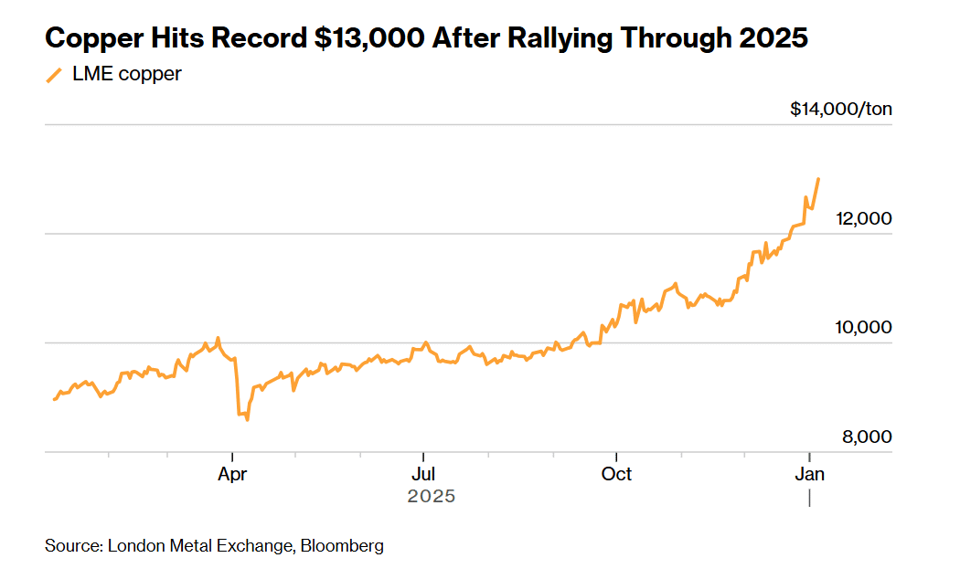 国际铜价在首次突破每吨 13000 美元后延续强劲涨势,新一轮向美国运铜的热潮,让交易商与投资者的多头情绪愈发高涨。此外,在供应担忧加剧的背景下,市场预期委内瑞拉的动荡也可能加速对关键矿产的争夺。