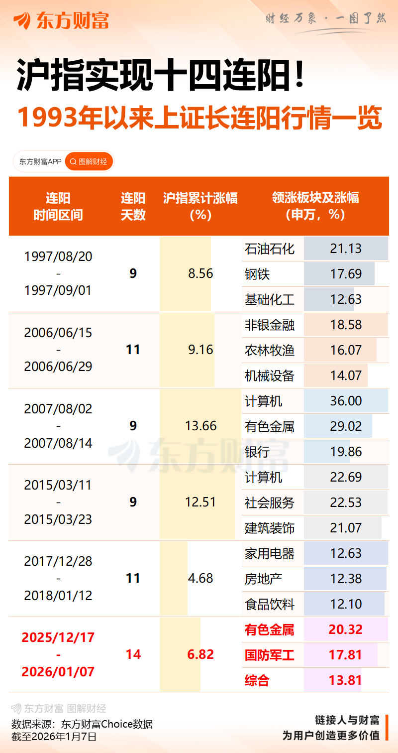 1 月 7 日,沪指微涨录得 14 连阳,创业板指冲高回落。截至收盘,沪指涨 0.05%,深成指涨 0.06%,创业板指涨 0.31%。