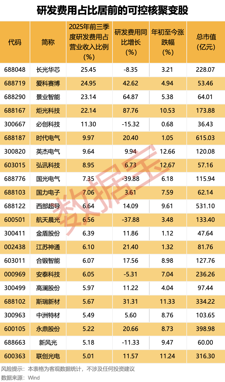据证券时报·数据宝统计,A 股中布局可控核聚变的个股有 59 只。数据显示,22 股 2025 年前三季度研发费用占营业收入比例在 5% 以上,长光华芯、爱科赛博、景业智能、炬光科技居前,均超过 20%。