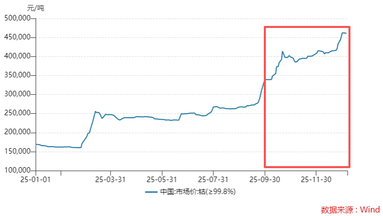 钴价回升启动更早,在 2025 年一季度便触底反弹,经过连续三个季度的上涨,钴价已由年初的 16.9 万元/吨上涨至年末的 46.21 万元/吨,全年涨幅超过 170%。其四季度均价约 40 万元/吨,环比涨幅超过 50%。