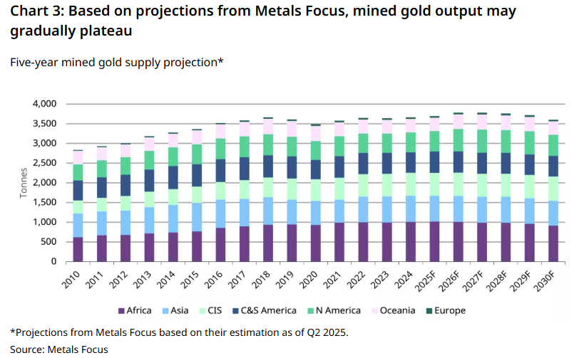 Metals Focus 咨询公司的预测数据显示,全球金矿产量或已临近峰值区间。不过未来几年,产量走势大概率是逐步进入平台期,而非见顶后随即回落。
