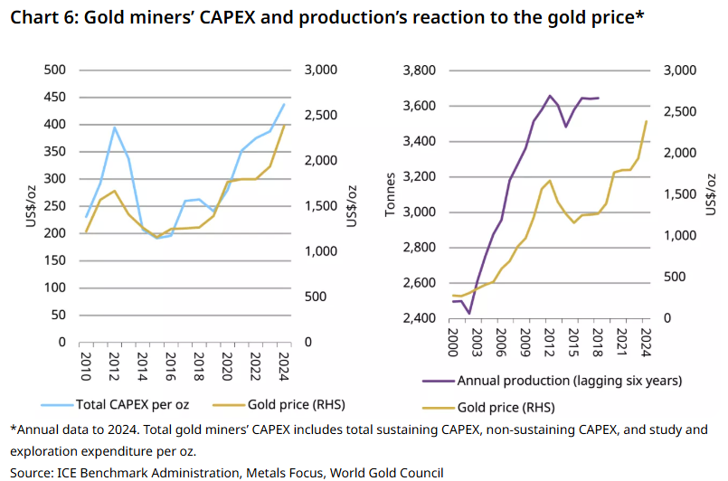 尽管老旧金矿复产与个体及小型金矿增产能够快速提振黄金产量,但正如前文所述,新金矿项目从启动到投产耗时漫长,且实施难度较大。世界黄金协会的研究发现,金价上涨通常会在同年带动矿企资本开支增加,但金矿产量对金价上涨的反应存在至少 6 年的滞后效应 (见图 6)。