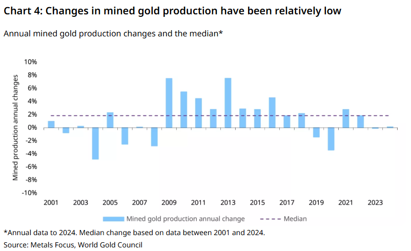 不妨先来复盘近年来全球金矿产量的稳定性特征。2023 年与 2024 年,全球金矿产量几乎没有变动;过去十年间,产量波动率仅为 2.3%,过去 15 年波动率为 2.7%,过去 20 年波动率也仅为 3%(见图 4)。