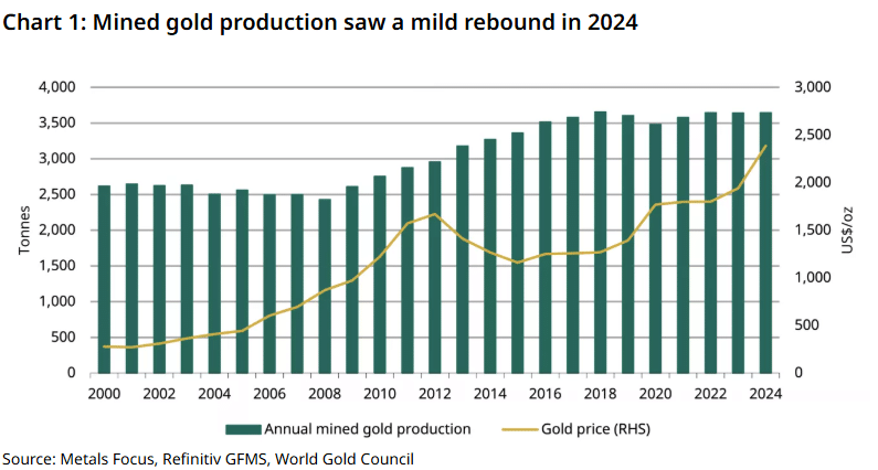 近年来,全球金矿开采量始终保持稳定态势。尽管受到疫情、停产整顿以及劳工运动等短期因素冲击,但 2018 年至 2024 年间,全球金矿年产量的同比变动幅度均值几乎为零。