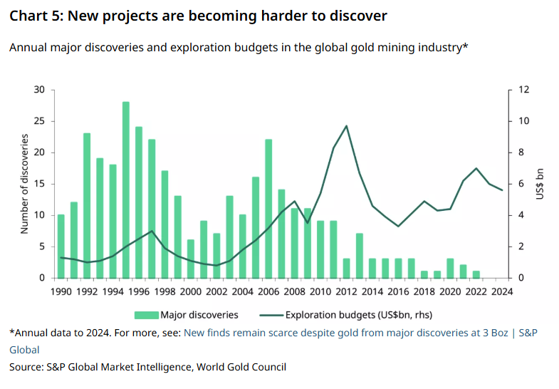 第二,金矿开采项目的建设周期较长,矿企难以在短期内快速增减产量。与此同时,新金矿的勘探、审批与建设难度正不断加大,大型金矿的发现数量也在持续下降 (见图 5),这导致金矿产量难以实现大幅增长。同样需要注意的是,现有金矿会逐渐步入老化与淘汰周期。如果缺乏利润率的驱动,中长期内金矿产量或面临下滑压力,老旧金矿产量的下降,甚至可能会抵消新投产项目带来的增量。