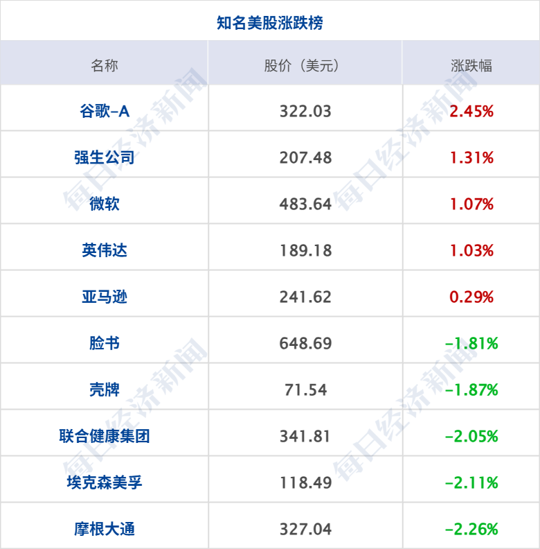 美股三大指数收盘涨跌不一,纳指涨 0.16%,标普 500 指数跌 0.34%,道指跌 0.94%;大型科技股多数上涨,英特尔涨超 6%,谷歌涨逾 2%,微软、英伟达涨超 1%,亚马逊小幅上涨;Meta 跌逾 1%,苹果、特斯拉小幅下跌。其中,谷歌市值达到 3.89 万亿美元,超过苹果公司的 3.85 万亿美元,为 2019 年以来首次。中概股多数下跌,纳斯达克中国金龙指数跌 1.58%,满帮跌超 7%,腾讯音乐跌超 5%,贝壳、网易等跌超 3%,金山云、阿里巴巴等跌超 2%,富途控股、哔哩哔哩等跌超 1%;传奇生物涨超 8%,百度、蔚来小幅上涨。