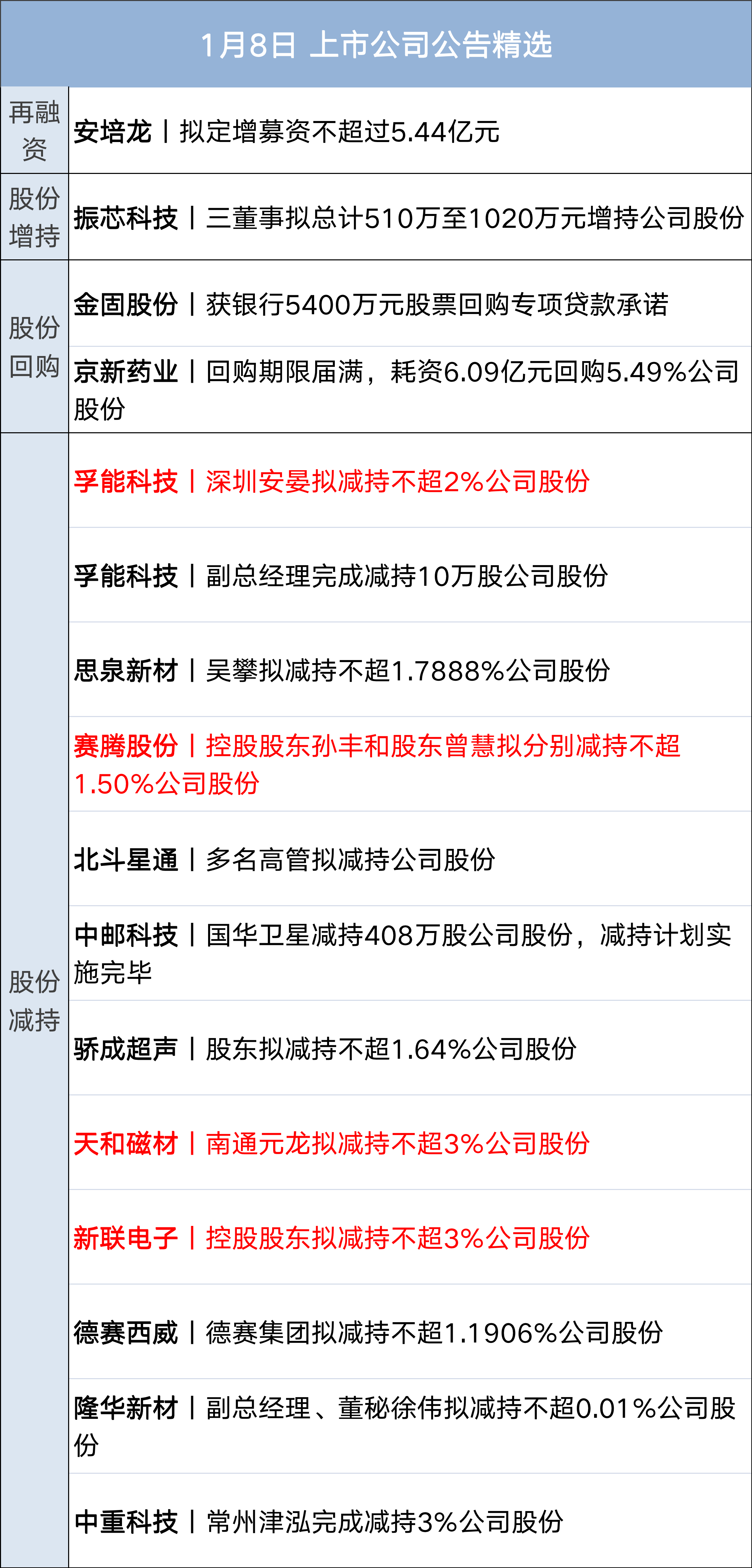 毛戈平 (HK01318,股价 87.95 港元,市值 431.1 亿港元):1 月 6 日晚间,毛戈平化妆品股份有限公司发布减持公告。公司控股股东及执行董事毛戈平、汪立群 (毛戈平配偶)、执行董事毛霓萍 (毛戈平姐姐)、毛慧萍 (毛戈平姐姐)、汪立华 (汪立群弟弟) 及宋虹佺基于自身财务需求,拟在减持预披露公告发布之日起 6 个月内,主要通过大宗交易方式合计减持其所持有的公司 H 股股份数量不超过 1720 万股,即不超过公司已发行股份总数的 3.51%。经计算,折合人民币超 12 亿元。