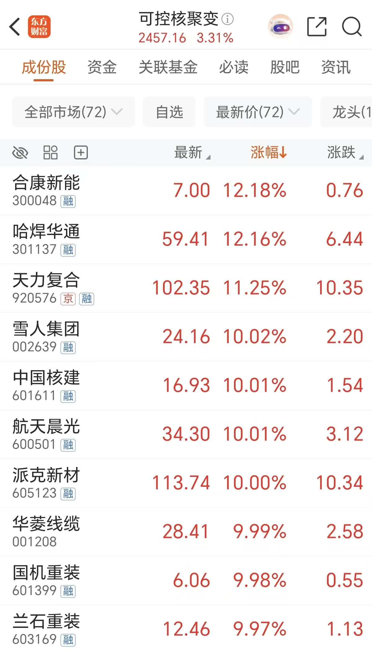 周四可控核聚变也延续强势,哈焊华通、天力复合、合康新能等涨超 10%,雪人集团、中国核建、华菱线缆等多股涨停。