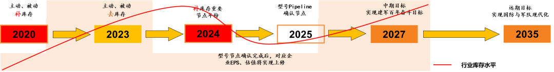 方正军工表示,军工行业有望开启新一轮补库周期:按库存周期的四个阶段来看,军工行业在 2020 年开启主动补库存,随后 2021 年批量采购到来,库存中原材料不断主动/被动进行补库,于 2023 年达到原材料库存的高值。行业于 2024Q1 进入主动去库存阶段 (企业收入、利润下降显著),并于 2025 进入补库存周期。目前国防军工产业已进入新型号 Pipeline 管线持续落地期, 批产可期。