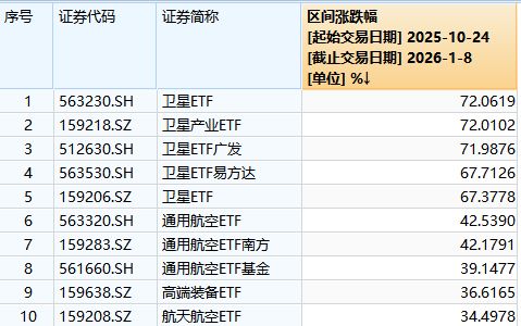 从 ETF 的表现来看,商业航天板块涉及的 ETF 基金,其区间最高涨幅才刚超过 70%。去年堪称最强的通信 ETF,其区间涨幅达到约两倍。即便不能与通信 ETF 相比,但与创新药、人形机器人等板块行情开启前后至结束前后的区间最大涨幅相比还有一定差距。