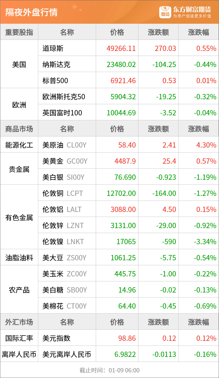 贵金属:芝商所 (CME)当地时间 8 日发出通知,上调贵金属品种履约保证金,这是其近一个月以来第三次发出此类通知。通知称,其将于当地时间 1 月 9 日盘后,全面上调黄金、白银、铂金、钯金期货品种的履约保证金。此外,大部分天然气合约的保证金将被下调。芝商所称,保证金的调整是基于对市场波动性以确保充足的抵押品覆盖的审查做出的。