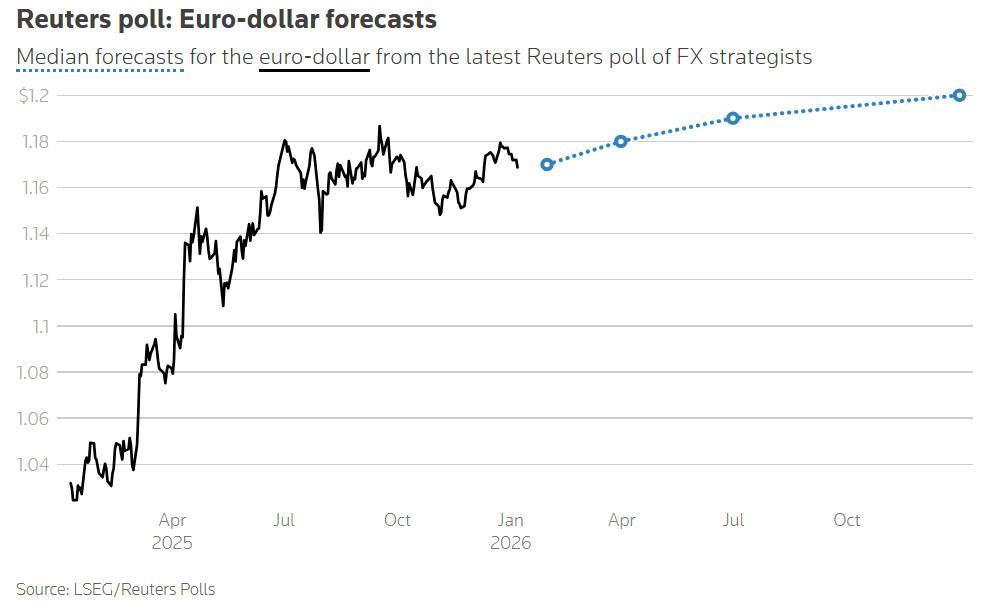 在 1 月 5 日至 7 日进行的路透社调查中,外汇预测机构的主流观点几乎未变,均认为美元的下跌趋势将持续。调查中值显示,欧元预计将每季度上涨约 1%,在年中兑美元达到 1.19,年底达到 1.20。在 71 位参与者中,仅有 17%(12 位) 预测欧元到 2026 年底会从当前水平走弱。