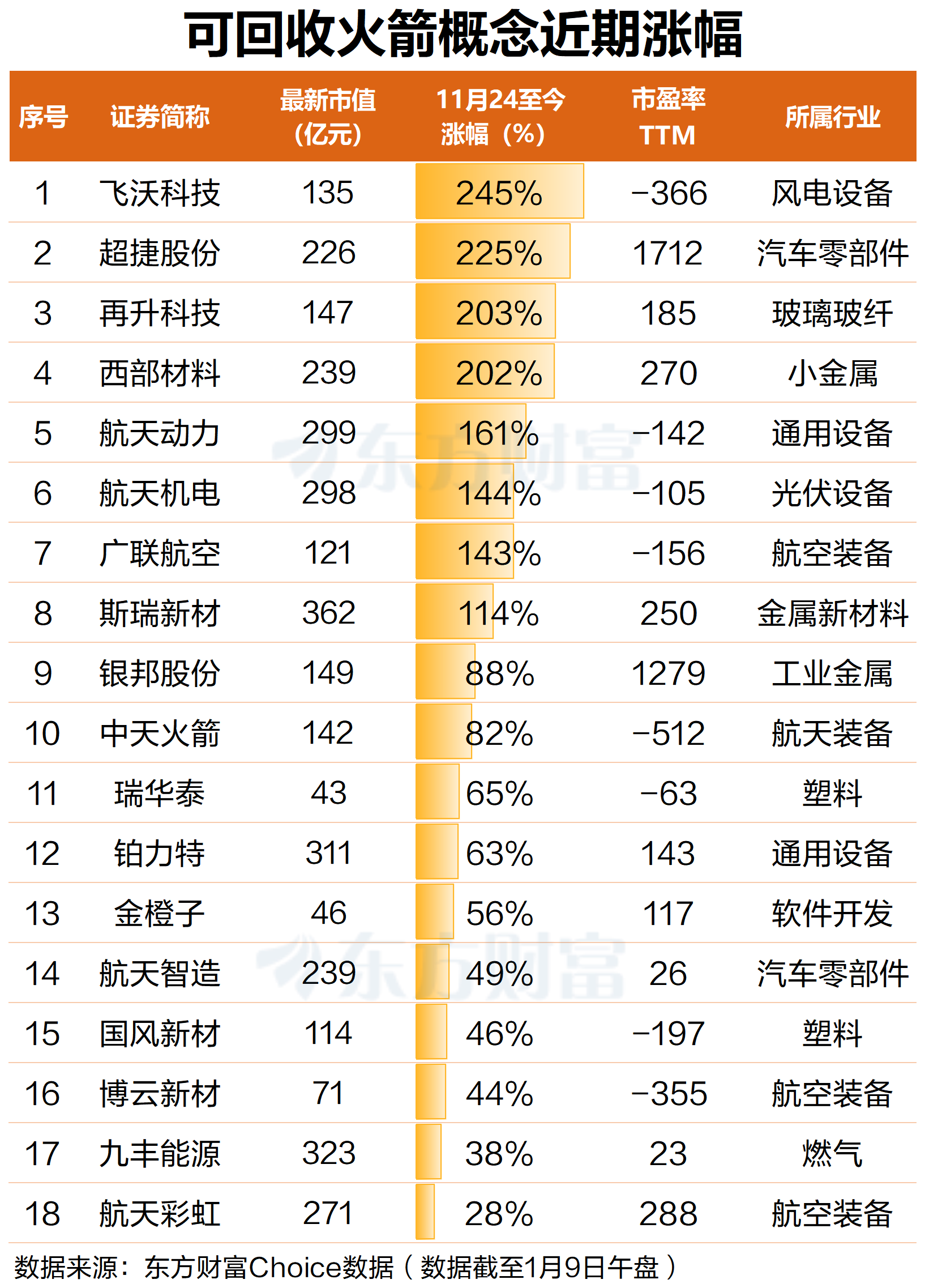 火箭结构件:飞沃科技、广联航空、超捷股份、航天机电、银邦股份、金橙子。