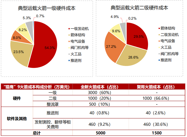 按照回收部分不同,可回收火箭可以细分为一子级/助推器回收、整流罩回收、组合体回收等。推进系统和箭体结构在火箭成本中占比较高;一级中两环节占比约 77.8%,二级中两环节占比约 58.1%。