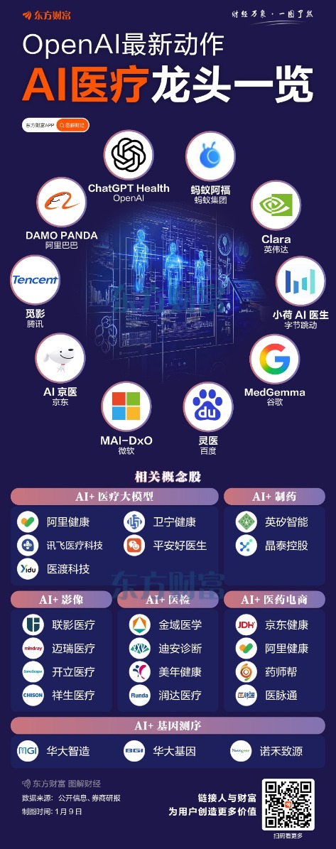 个股来看,有券商研报表示,AI 医疗方向可关注 AI+医疗大模型 (阿里健康、讯飞医疗科技等)、AI+影像 (联影医疗、迈瑞医疗等)、AI+医检 (金域医学、迪安诊断等)、AI+医药电商 (京东健康、药师帮等)、AI+基因测序(华大智造、华大基因等)、AI+制药 (英矽智能、晶泰控股等)。