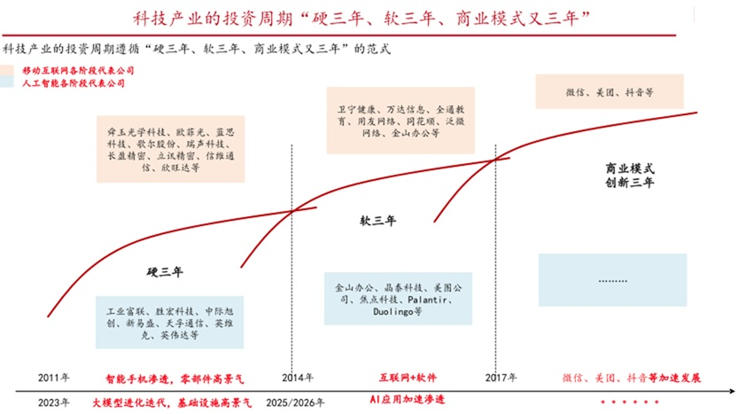 而方正证券从科技产业的投资周期角度认为,2026 年会是 AI 应用的投资元年。该机构表示,科技产业的投资周期遵循 「硬三年、软三年、商业模式又三年」 的范式。2022-2025 年,大模型持续进步迭代,驱动算力侧波澜壮阔的行情,光模块、PCB涨幅大幅领先。