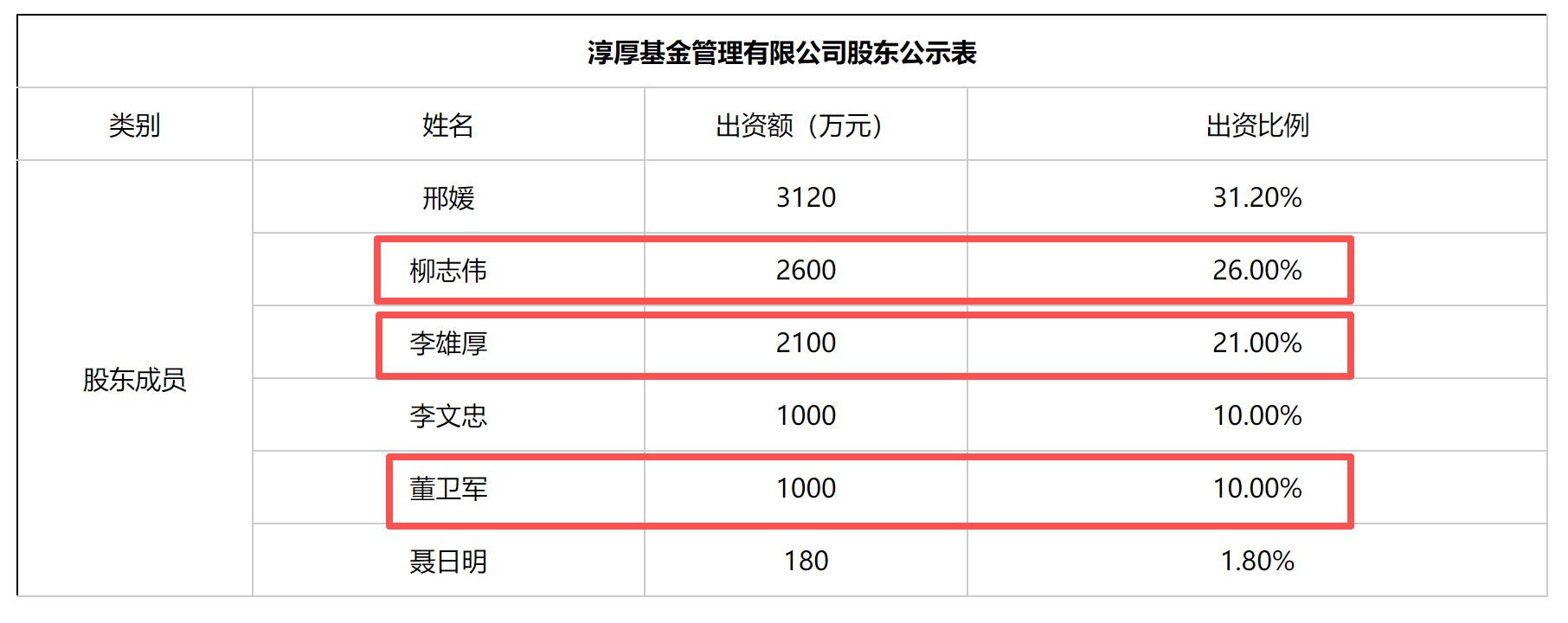 证监会在 2018 年 10 月 12 日发布了 《关于核准设立淳厚基金管理有限公司的批复》。其中显示,核准淳厚基金注册资本为 1 亿元人民币,股权结构全部为个人股东,包括邢媛、柳志伟、李雄厚、李文忠、董卫军、聂日明。