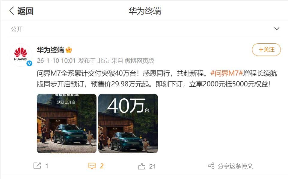 据华为终端官方微博1 月 10 日消息,问界 M7 全系累计交付突破 40 万台!问界 M7 增程长续航版同步开启预订,预售价 29.98 万元起。
