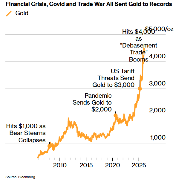 「黄金现在基本上是一种反法币的博弈,比任何其他属性都更重要,」摩根士丹利的首席投资官兼策略师迈克·威尔逊 (Mike Wilson) 表示。这一观点在 2025 年后几个月获得了广泛认同,当时所谓的 「货币贬值交易」 盛行,从肯·格里芬 (Ken Griffin) 到雷·达利欧 (Ray Dalio) 等投资者都将黄金的上涨视为一个警告信号。