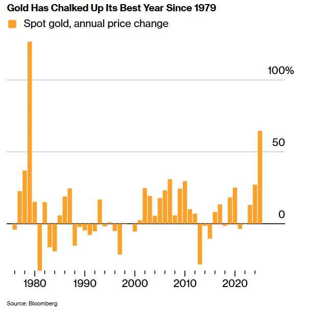 随着零售和机构投资者与各国央行一同涌入,黄金在 2025 年飙升了 65%——这是近半个世纪以来最强劲的表现。在几乎所有支撑这种贵金属的顺风因素 (从利率下降到地缘政治紧张) 都汇聚在一起的这一年,金价甚至突破了自 1980 年以来保持的经通胀调整后的历史高位。