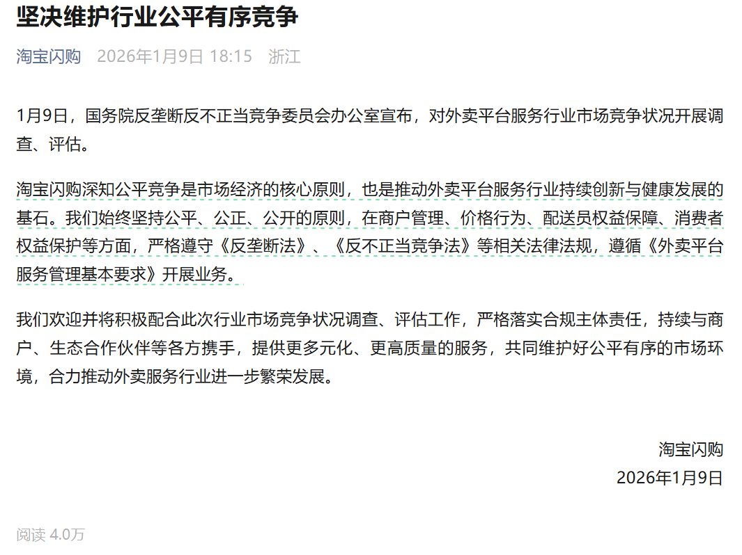 1 月 9 日,据淘宝闪购官微消息,1 月 9 日,国务院反垄断反不正当竞争委员会办公室宣布,对外卖平台服务行业市场竞争状况开展调查、评估。