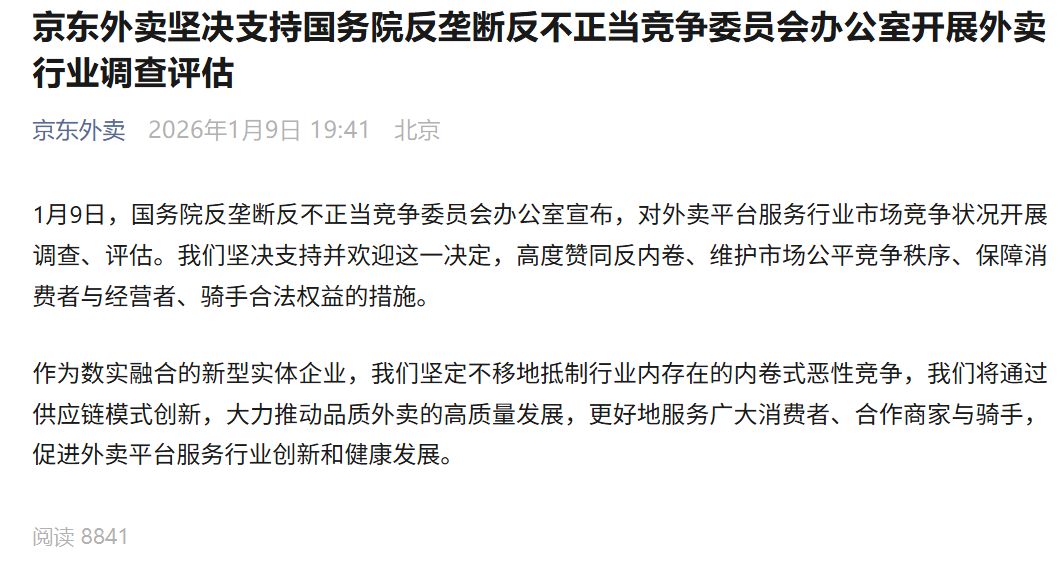 据京东外卖官微消息,1 月 9 日国务院反垄断反不正当竞争委员会办公室宣布,对外卖平台服务行业市场竞争状况开展调查、评估。我们坚决支持并欢迎这一决定,高度赞同反内卷、维护市场公平竞争秩序、保障消费者与经营者、骑手合法权益的措施。