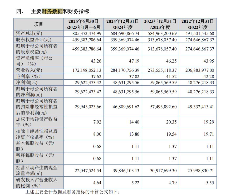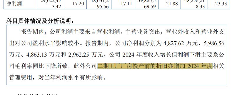 2024 年,尽管收入微增至 2.84 亿元,净利润却同比下滑约 18.77%。对于这一反差,公司称,主要系毛利率同比下降所致,此外公司二期工厂厂房投产前的折旧亦增加 2024 年度相关管理费用,对当年利润水平有所影响。