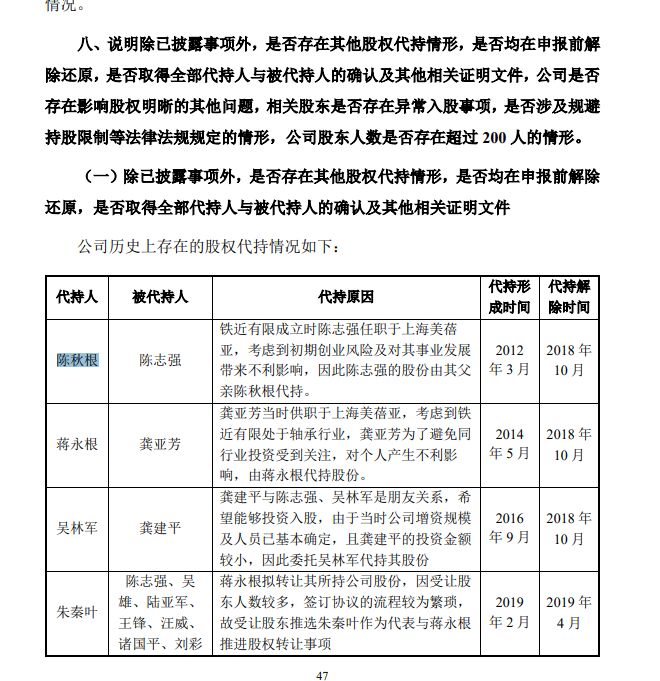 铁近科技发展初期,一段 「影子持股」 的插曲揭示了其与行业巨头间的微妙联系:2012 年铁近有限 (公司前身) 成立时,实控人陈志强仍任职于上海美蓓亚。为规避创业初期可能带来的职业风险,其持股由父亲陈秋根代为持有。