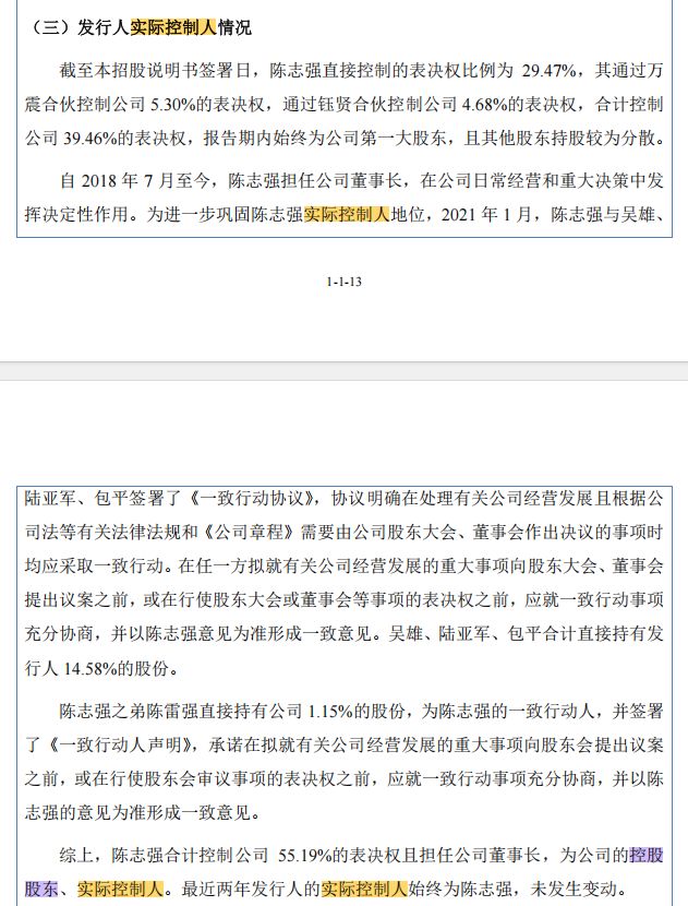 为进一步巩固控制权,陈志强与吴雄、陆亚军、包平签署了 《一致行动协议》。后三者合计直接持股 14.58%,加之陈志强弟弟陈雷强持有的 1.15% 股份,均被视为一致行动人。据此,陈志强实际控制的表决权比例达到 55.19%,并通过担任董事长,确立了其控股股东与实际控制人的地位。