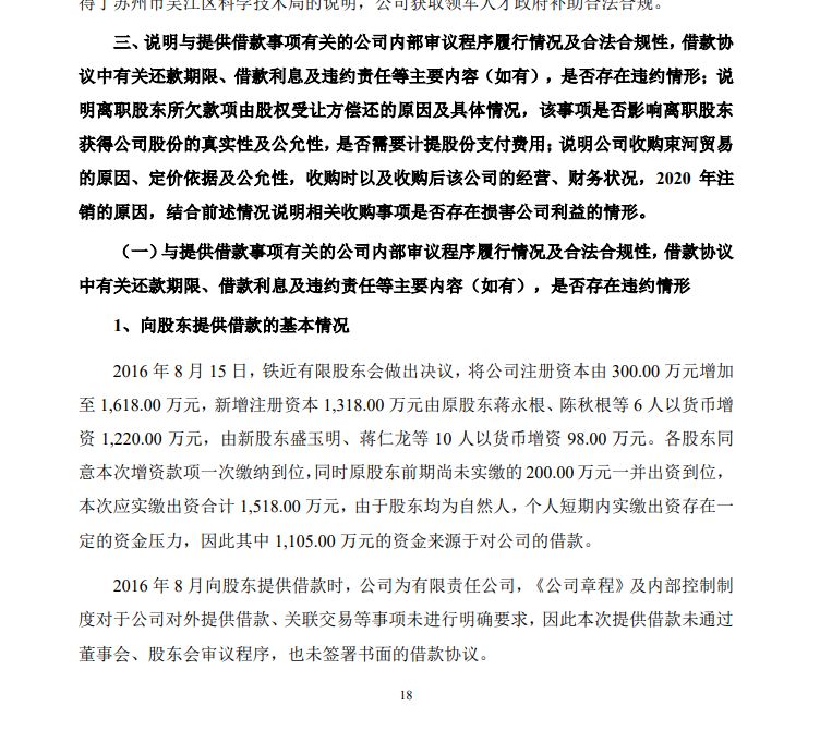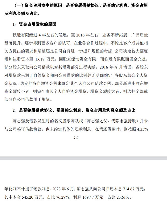 1 月 9 日,铁近科技对此回复称,当时部分股东为自然人,短期内实缴出资存在资金压力,因此部分增资款来源于公司借款。2023 年,在为上市进行内控梳理过程中,公司在中介机构指导下完成了资金占用清理,相关股东已偿还全部借款本息。