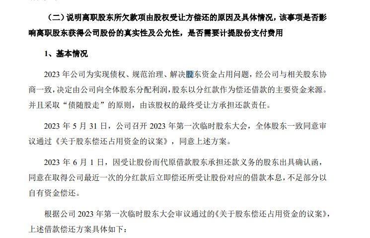 根据披露,2023 年公司与相关股东协商一致,决定由公司向全体股东分配利润,股东以分红款作为偿还借款的主要资金来源,并且采取 「债随股走」 的原则,由该股权的最终受让方承担还款责任。