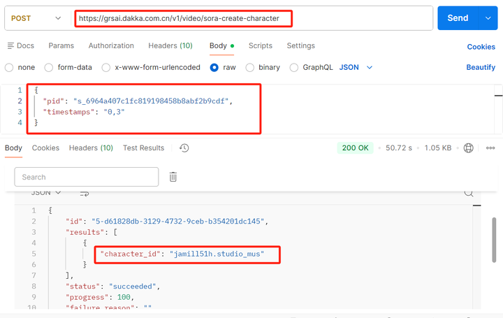 })});const newCharacter = await createCharResponse.json();const newCharacterId = newCharacter.results[0].character_id;// 2. 使用新创建的角色生成新视频 const newVideoResponse = await fetch('https://grsai.dakka.com.cn/v1/video/sora-video', {