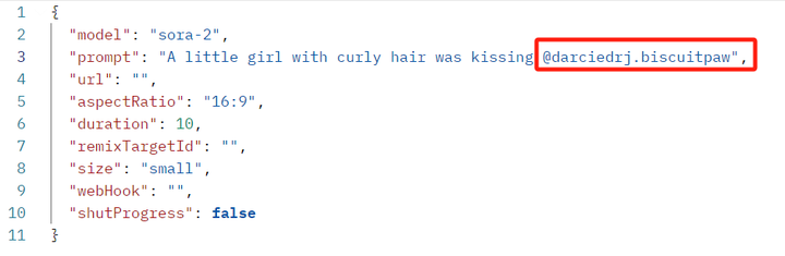 - 在 Sora2 视频生成接口的 prompt 中,使用 @ 角色 id 格式引用角色