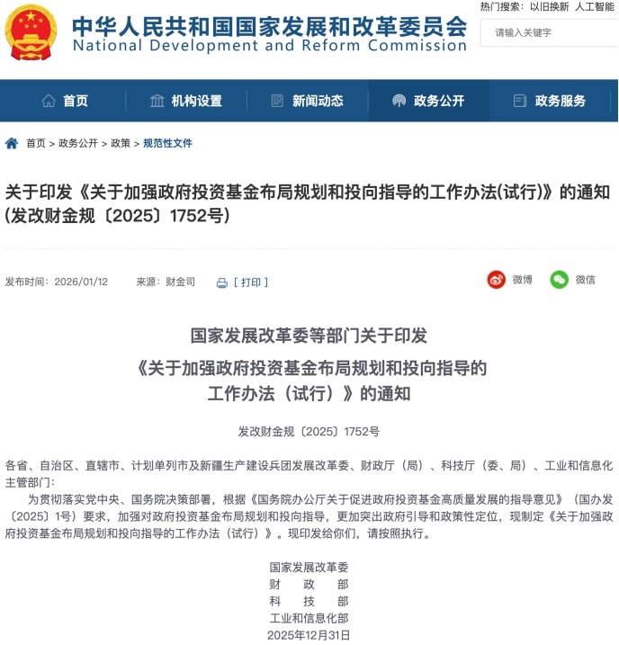 1 月 12 日,国家发展改革委、财政部、科技部、工业和信息化部联合发布 《关于加强政府投资基金布局规划和投向指导的工作办法》(以下简称 《工作办法》)。国家发展改革委相关负责人表示,这是首次在国家层面对政府投资基金的布局和投向作出系统规范。