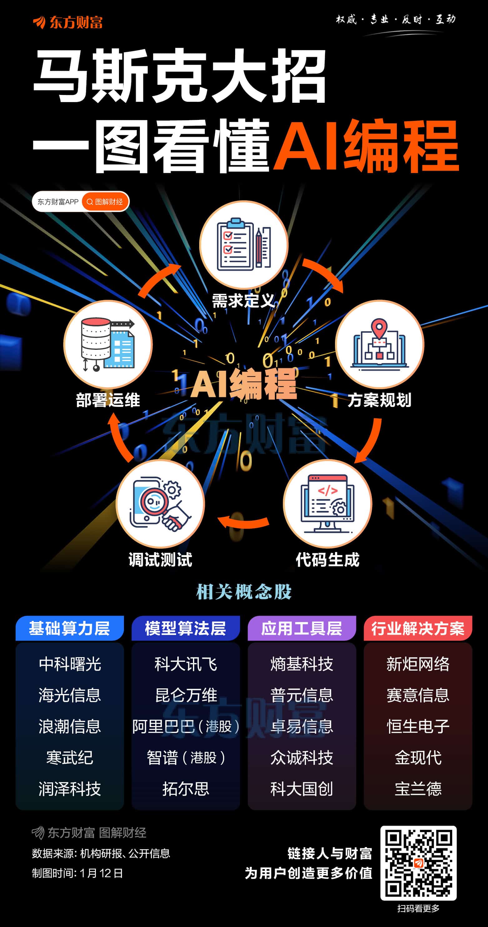 周一 (1 月 12 日)AI 应用端再度爆发,AI 编程概念领涨,众诚科技30cm 两连板,科大国创、普元信息、卓易信息、金现代等多股 20cm 涨停,熵基科技涨超 17%, 直真科技、新炬网络等涨停。