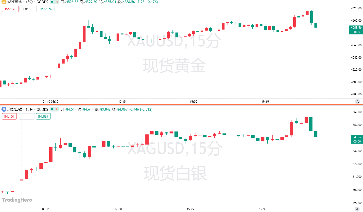 周一美盘,黄金一度涨超 2%,并将历史记录刷新至 4620 美元上方,白银一度暴涨超 7%。截止发稿前,二者均有所回落。