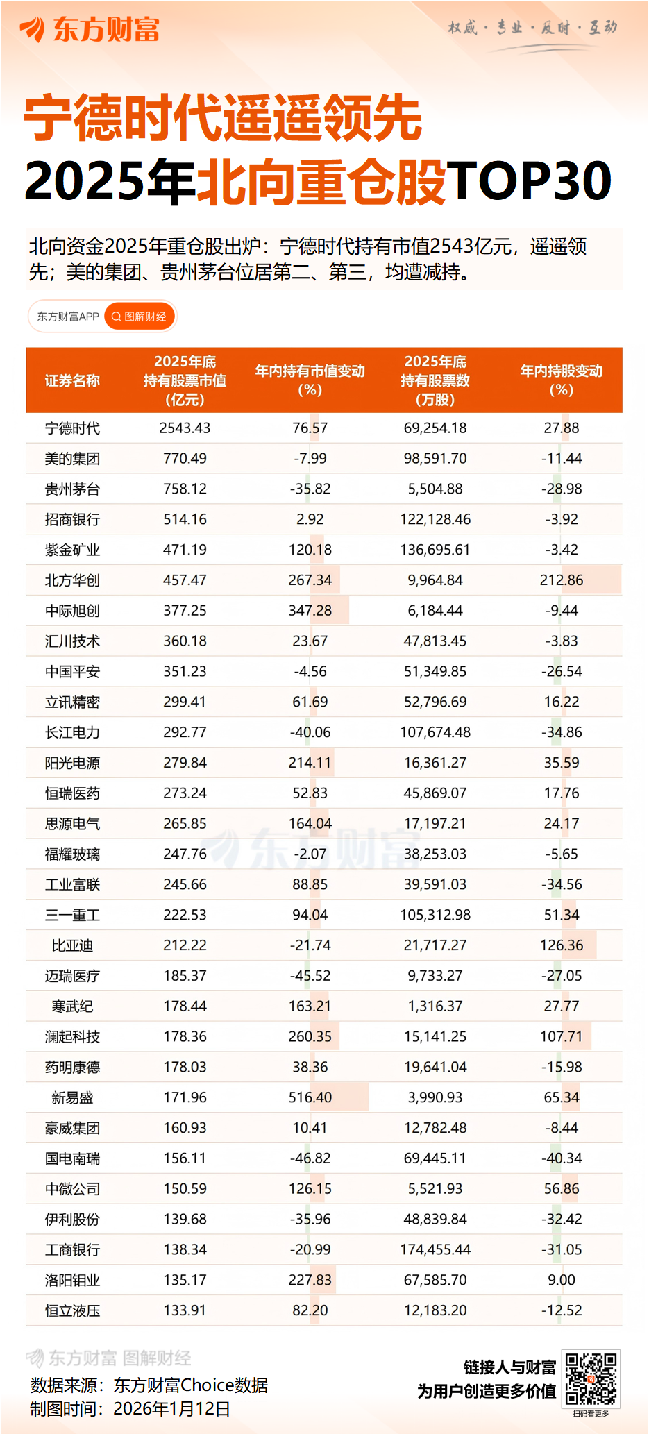 A 股市场持续走强,北向资金活跃度也稳步提升。1 月 12 日,北向资金买入和卖出成交额合计 3989.80 亿元,较前一日增长 7.94%,且连续 2 日增长,单日买卖总成交额创互联互通机制开通以来第三高,仅次于 2024 年 10 月 8 日以及 2025 年 8 月 25 日的成交额。其中,沪股通成交额 1728.58 亿元;深股通成交额 2261.22 亿元,成交额创历史第二高,仅次于 2024 年 10 月 8 日。
