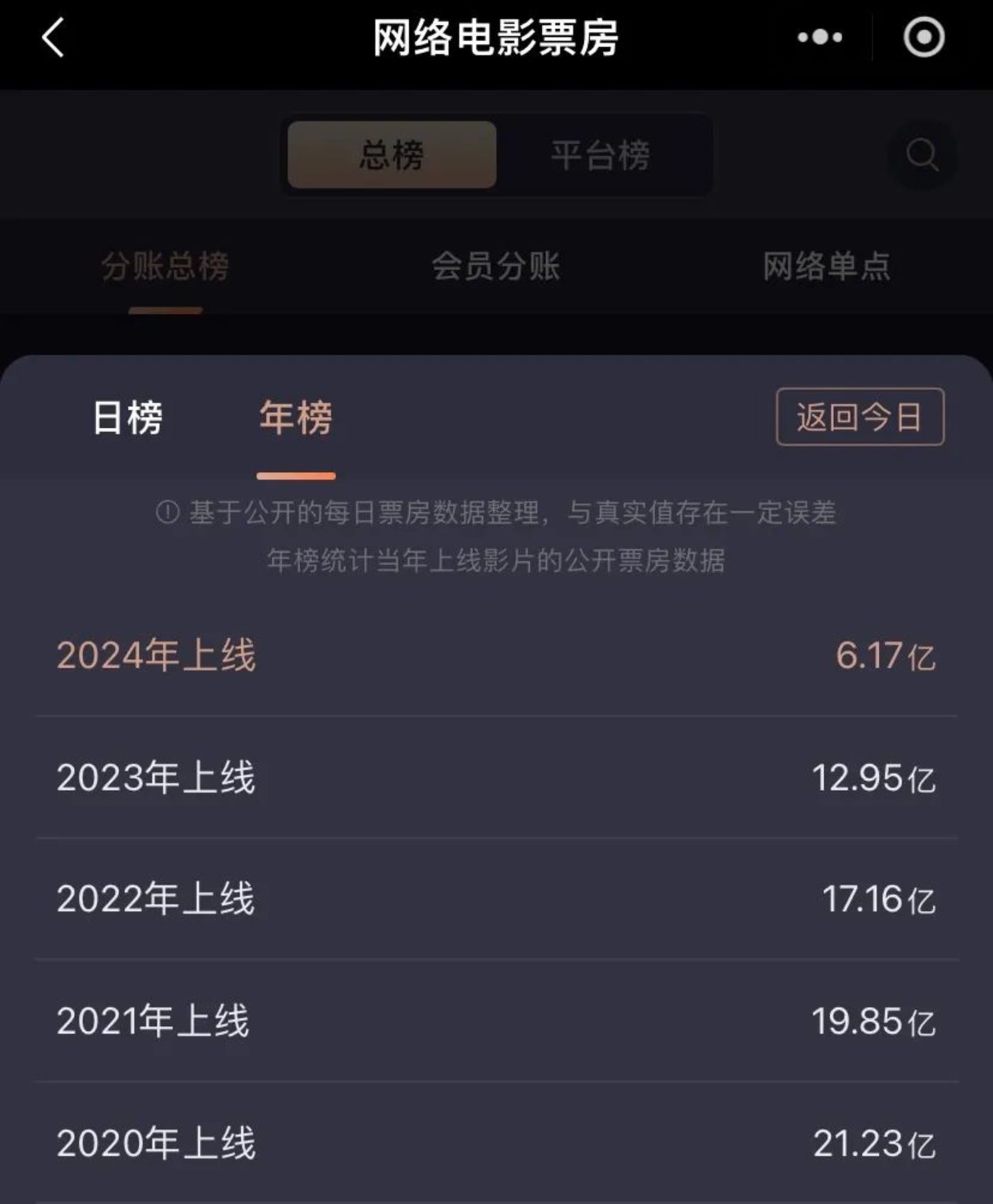 当然,千万小时网络电影的减半并不是爱奇艺一家的问题,而是整个行业几年以来颓势的延续。据云合数据,从 2022 年到 2024 年,分账破千万的网络电影数量从 50 部、38 部一路下滑到 15 部,头部影片数量以及票房产出能力缩水严重,腰部作品也未能撑起大盘,而是出现了同步萎缩。2023 年,云合数据网络电影分账总榜 TOP 100 的门槛是 386 万,今年已经降低到了 122 万。