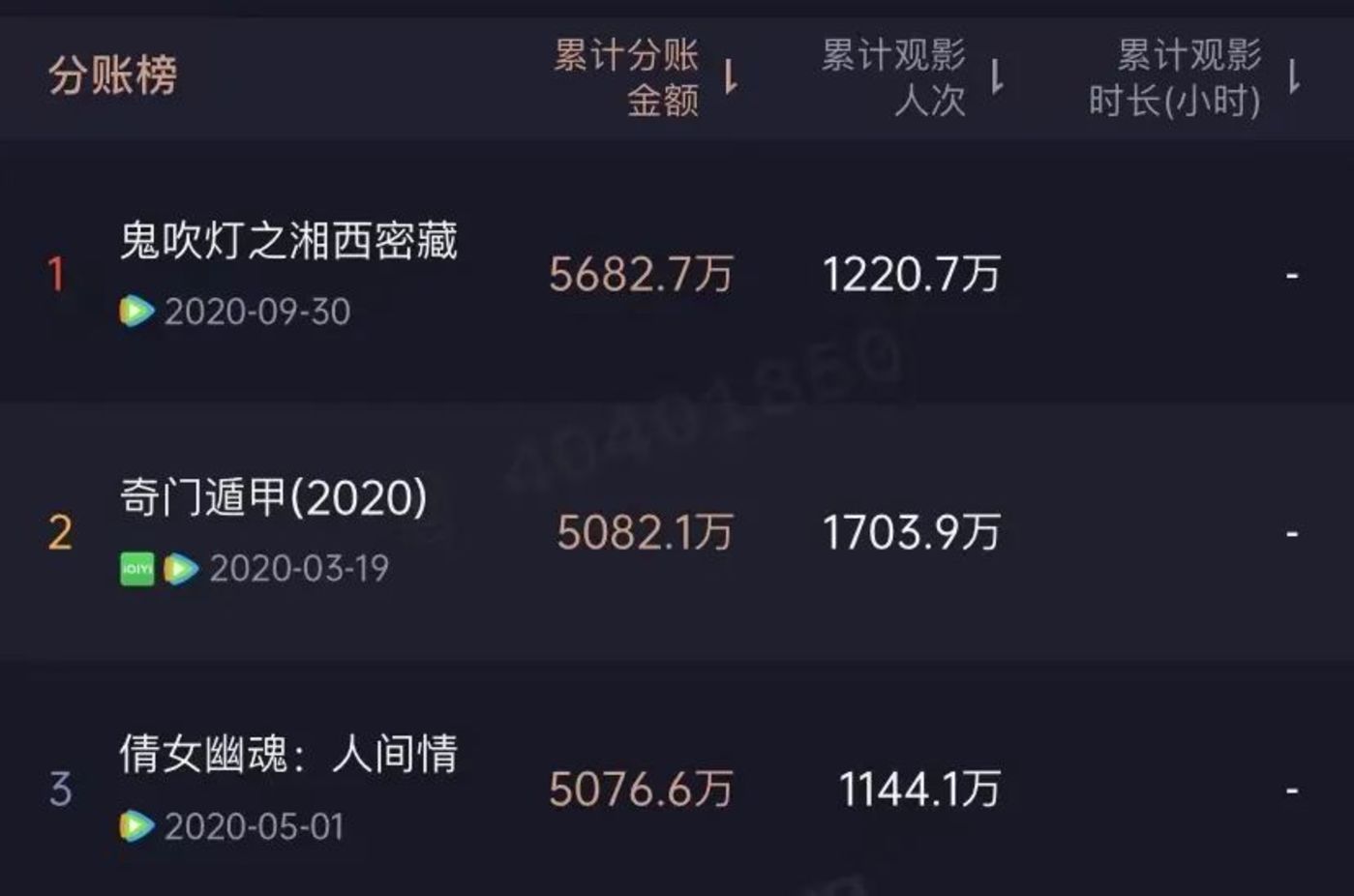 2020 年,实体院线的间歇性停摆,曾经为网络电影创造了得天独厚的机会窗口,也让它迎来了爆款频出、话题度拉满的高光时刻。《鬼吹灯之湘西密藏》 以 5600 万刷新了网络电影的分账票房纪录,创作团队获得了腾讯视频 800 万的高额奖励金。另外两部 IP 大作 《奇门遁甲》《倩女幽魂:人间情》 分账票房也都突破了 5000 万。业内都以为这将是网络电影行业爆发的起点,如今回过头看,却成了无法逾越的高峰。