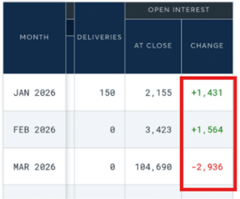 审视 1 月 7 日的数据,分析师发现 2026 年 1 月合约的未平仓量增加了 1431 手。2026 年 2 月合约的未平仓量也增加了 1564 手。这使得这两个月的总持仓量增加了 2995 手。与此同时,2026 年 3 月合约的持仓量几乎以相同的数量下降——2936 手。