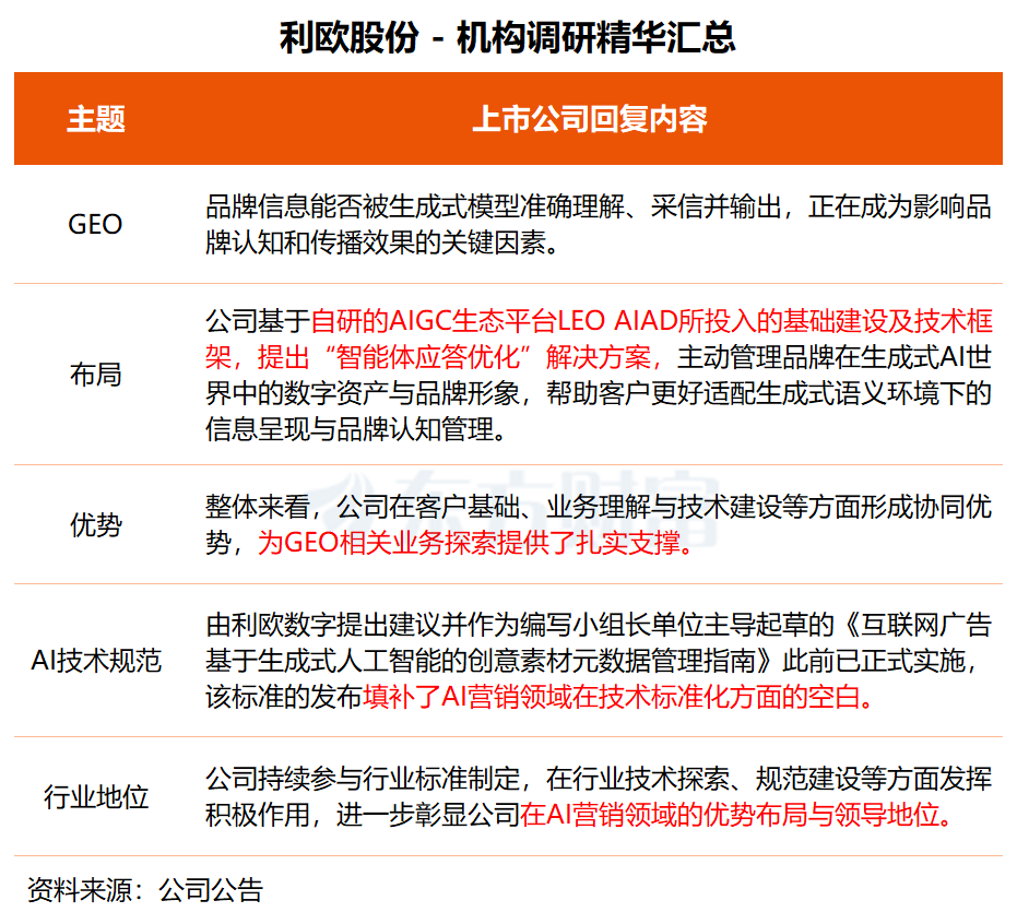 在调研中,利欧股份表示,公司在客户基础、业务理解与技术建设等方面形成协同优势,为 GEO 相关业务探索提供了扎实支撑。