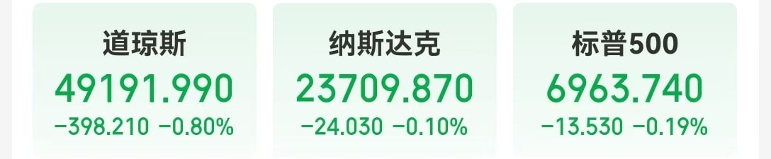 当地时间 1 月 13 日,道指下跌 398.21 点,跌幅 0.80%;纳指跌 0.1%,标普 500 指数跌 0.19%。