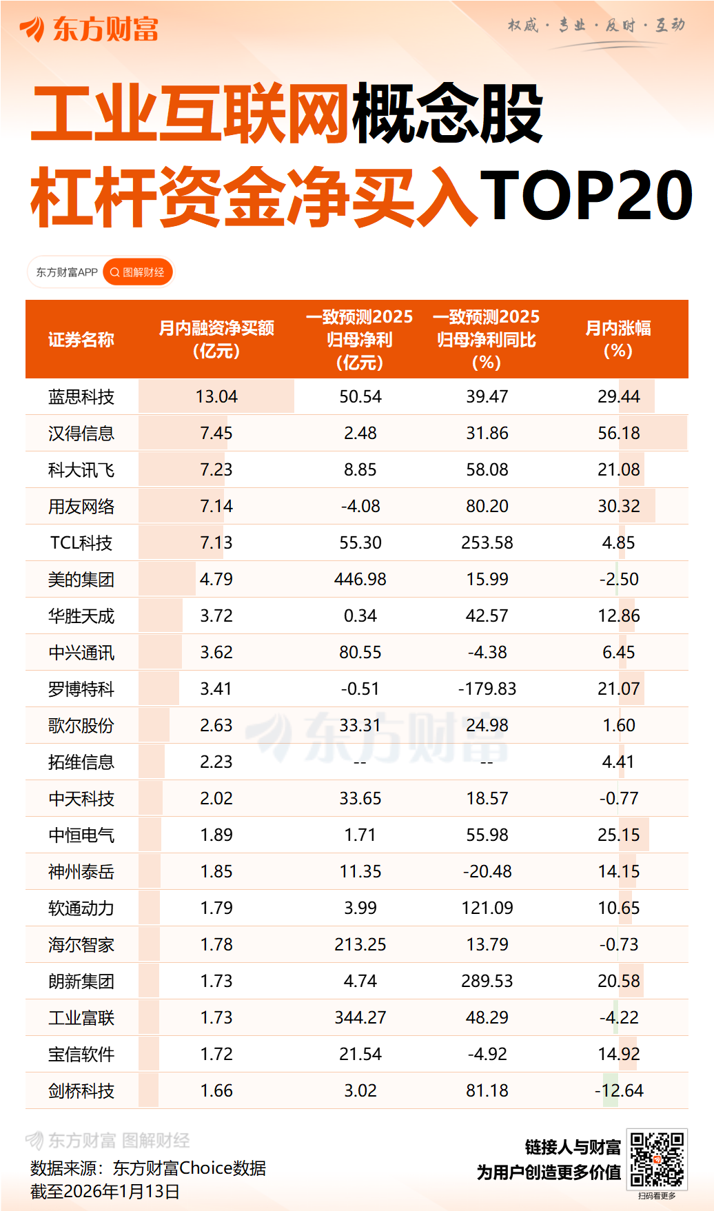 据证券时报·数据宝统计,A 股中布局工业互联网产业链的个股共有 53 只,1 月 13 日普遍回调,仅 10 股实现上涨,用友网络、赛微电子、东土科技涨幅居前,分别为 7.87%、6.72%、3.11%。