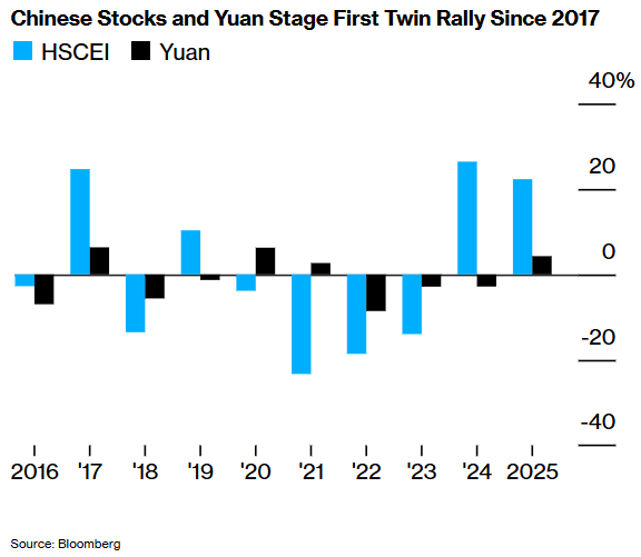 追踪香港上市中国公司股票的一项关键指标去年上涨超过 22%,使其成为全球表现最佳的主要指数之一。人民币兑美元汇率在 2025 年升值超过 4%,为五年来的最大年度涨幅。这是自 2017 年以来两者首次同步上涨。