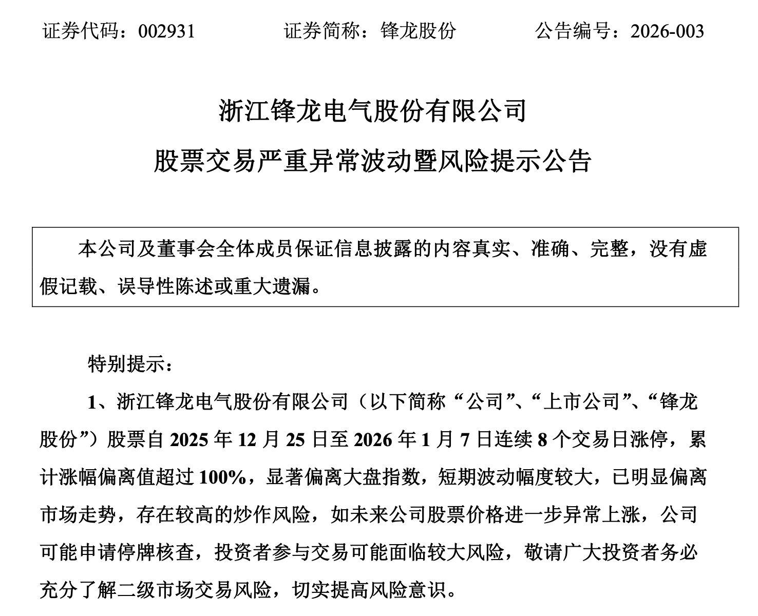 13 连板牛股锋龙股份 (002931.SZ)1 月 13 日晚间公告称,公司股票自 2025 年 12 月 25 日至 2026 年 1 月 13 日已连续 12 个交易日涨停,价格涨幅为 213.97%,已严重背离公司基本面。