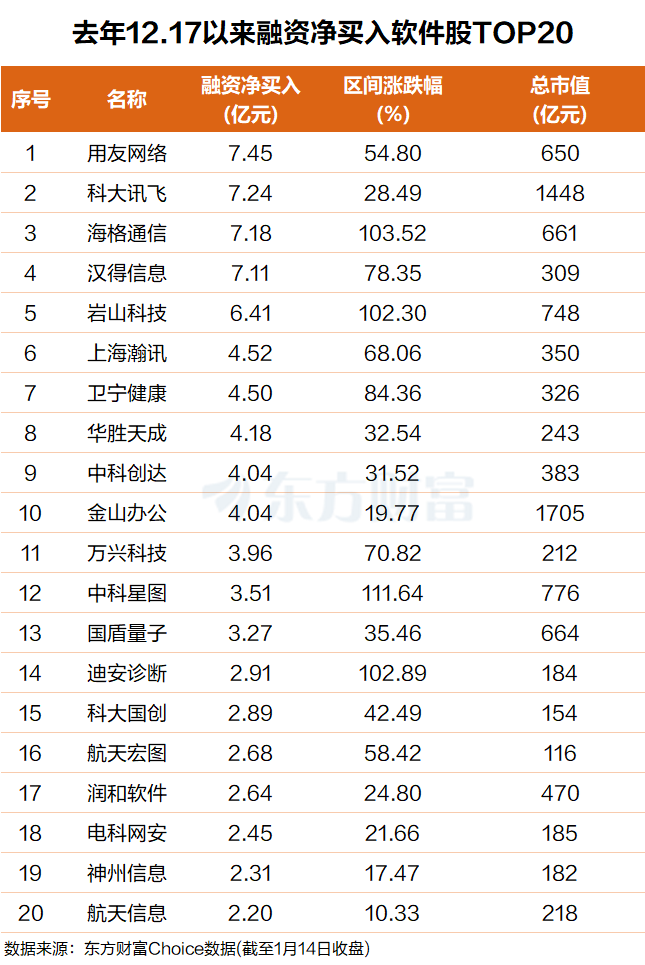 具体来看,用友网络排名第一,融资净买额 7.5 亿元,期间涨幅 55%;科大讯飞排名第二,融资净买额 7.2 亿元,期间涨幅 28.5%。