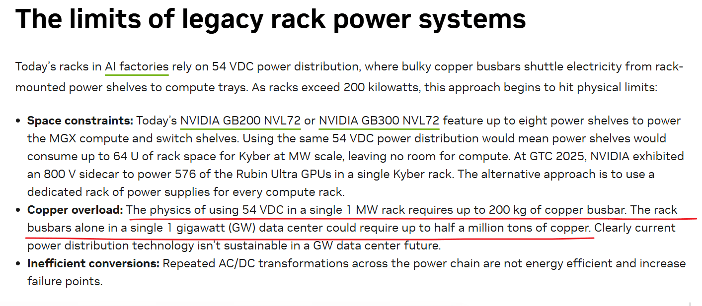 近日,《福布斯》 杂志翻出了英伟达 (NVDA) 一份去年 5 月首次发布的技术报告,这份最初源于英伟达技术简报的文件,随后在各类研究报告与人工智能训练数据集中广泛传播。英伟达在报告中称,传统架构中,单个 1 兆瓦机架在物理上要求高达 200 千克的铜母线,单个 1 吉瓦的机架则可能需要多达 50 万吨的铜。显然,现有电力分配技术,难以支撑未来吉瓦级数据中心的大规模建设需求。相关表述目前仍可在其官网查询。