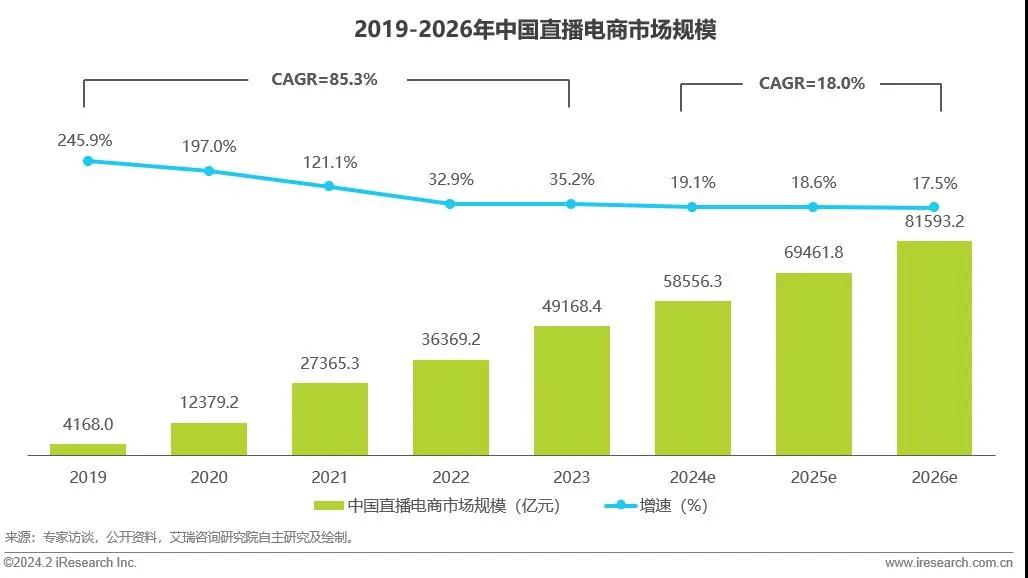 直播电商增速也从爆炸式的 245.9%,逐渐下落至两位数,据艾瑞咨询预计,2024—2026 年,其增速会稳定在 18% 左右。