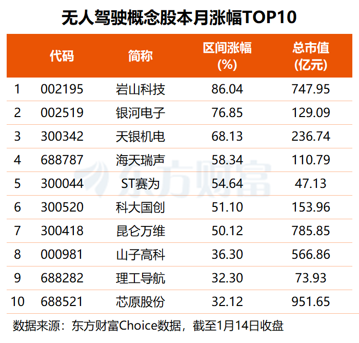 市场表现方面,2026 年以来,超八成无人驾驶概念股录得股价上涨。叠加人脑工程与 AI 概念的岩山科技涨幅居首,公司今年前 8 个交易日累计涨幅高达 86.04%;银河电子、天银机电位居二三位,区间涨幅分别为 76.85% 和 68.13%;海天瑞声、ST 赛为、科大国创、昆仑万维月内涨幅均在 50% 以上。