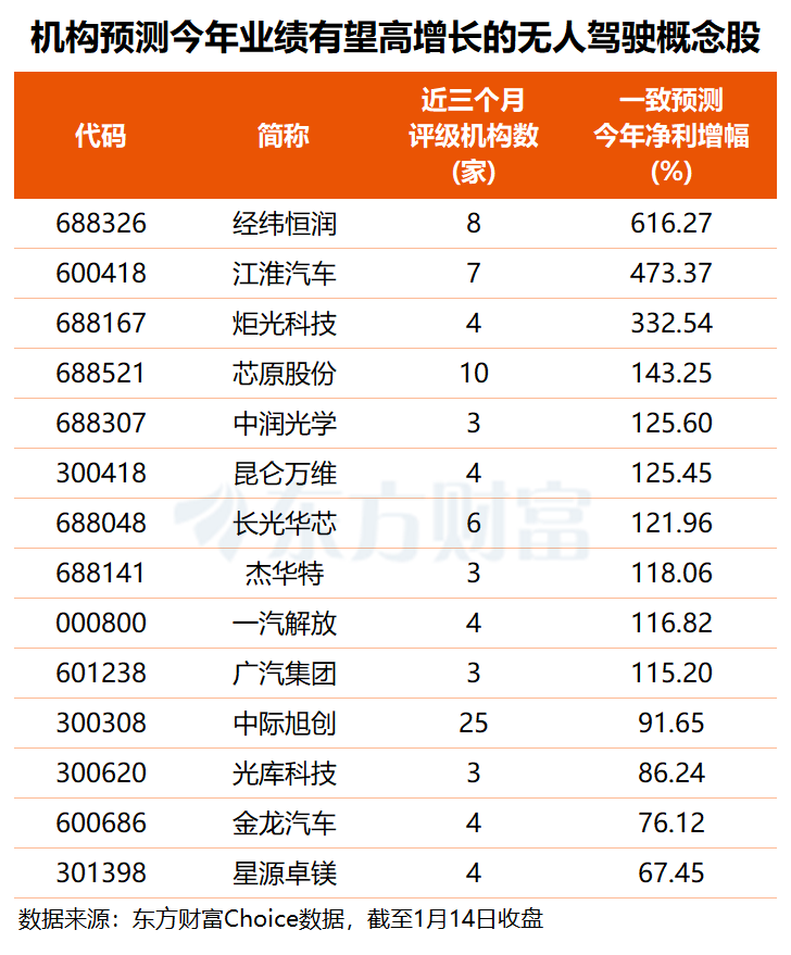 未来增长潜力方面,根据 3 家及以上机构一致预测,共 10 只无人驾驶概念股 2026 年业绩有望翻倍增长,其中,机构预测经纬恒润今年净利有望同比大增超 6 倍,江淮汽车、炬光科技业绩有望分别高增约 473% 和 333%;芯原股份、中润光学、昆仑万维、长光华芯、杰华特、一汽解放、广汽集团7 股今年预测净利增幅均在 115% 至 145% 之间。